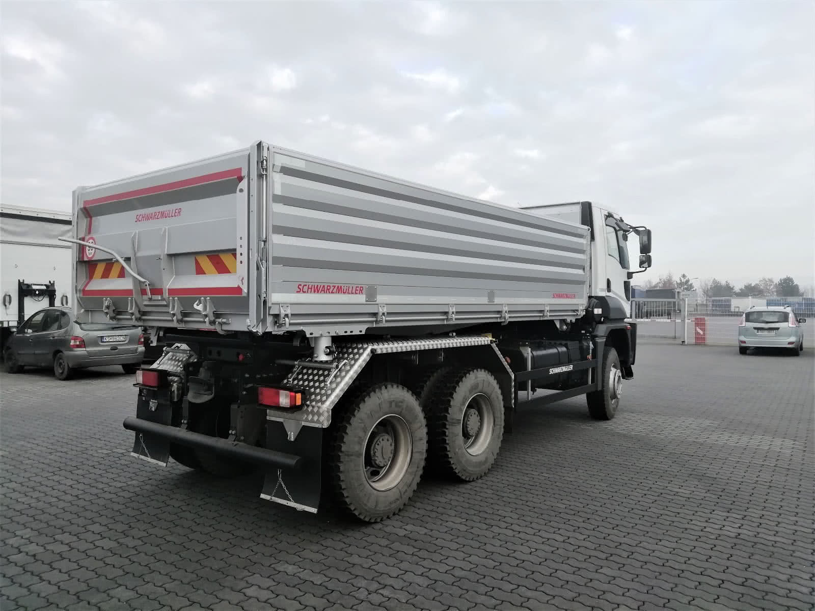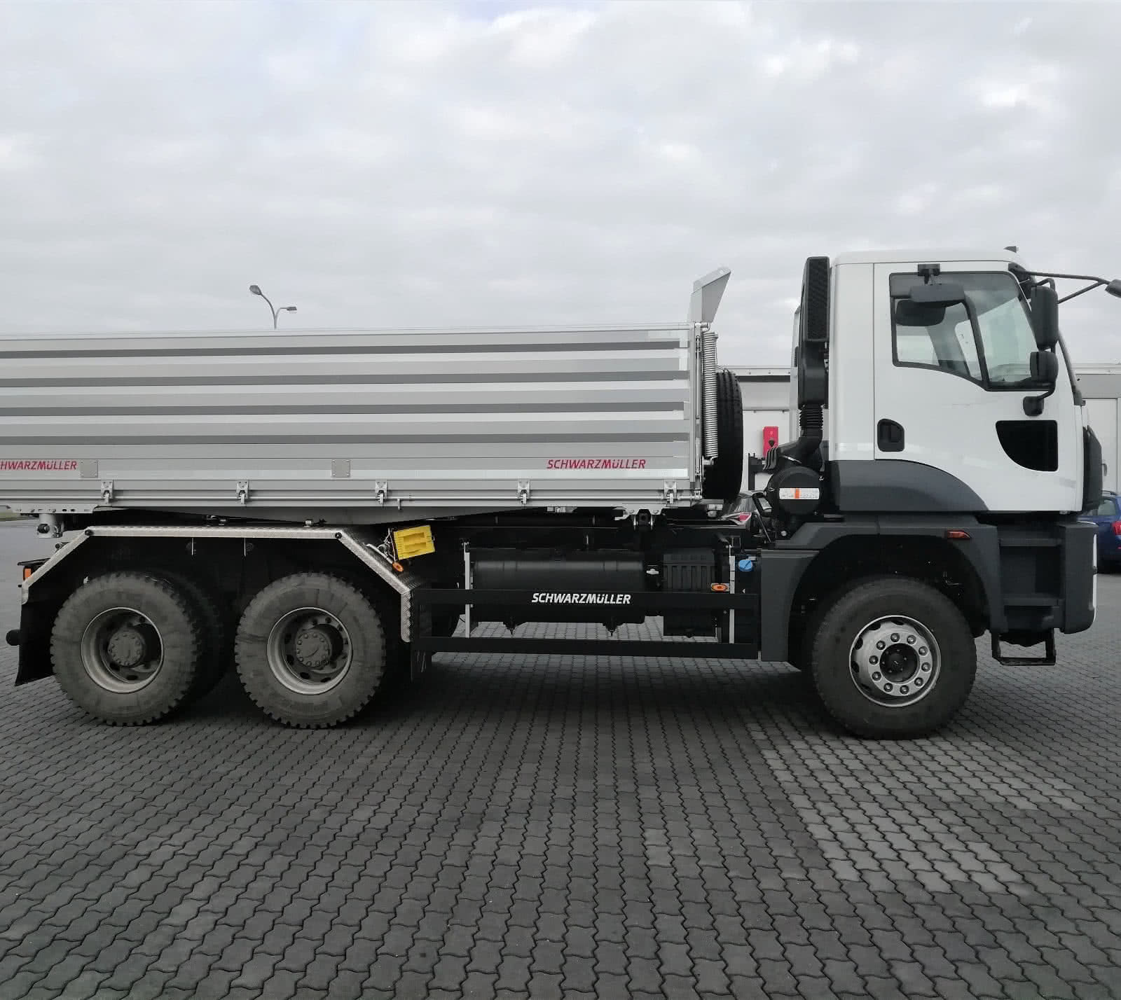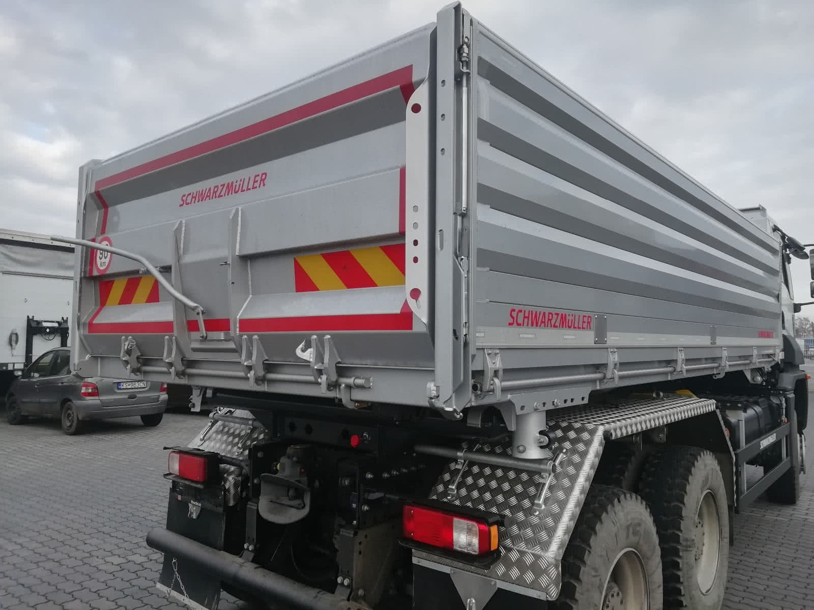 Těsně před Vánocemi rozšířila naši flotilu předváděcích vozidel nová sklápěčka. Na podvozku Ford Cargo 3542 s pohonem 6x4, motorem o výkonu 420 koní a točícím momentem 2 150 Nm, motorovou brzdou, manuální 16rychlostní převodovkou ZF a přípojným zařízením byla realizována 3stranná sklápěcí nástavba Schwarzmüller o objemu 10,9 m3. Odlehčená korba vč. mezirámu váží pouhých 2 500 kg. Sklápění levé bočnice je manuální s asistencí pružin.